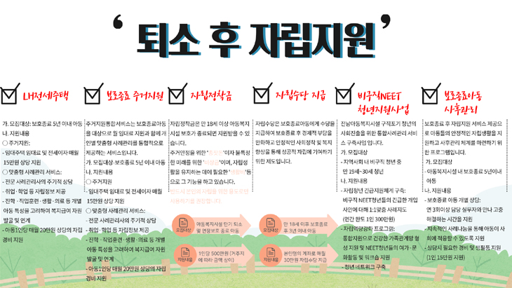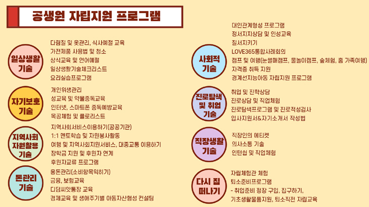 - Åð°Å û¼Ò³â¿¡ ´ëÇÑ Á¤¼ÀûÀÎ À¯´ë°ü°è¸¦ À¯ÁöÇϰí, Ãë¾÷¾Ë¼±°ú ´ëÇÐ ÁøÇÐ, ÁÖ°Å Áö¿ø µî ÇÊ¿äÇÑ ´Ù¾çÇÑ ÀÚ¸³Áö¿ø ¼ºñ½º°¡ ¿ä±¸µÊ.